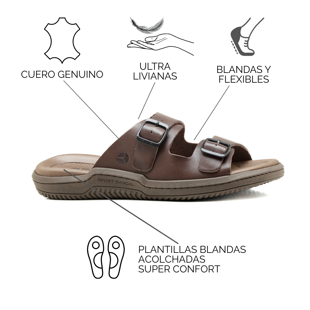 Ficha técnica: Capellada: Cuero vacuno con doble tira regulable Plantilla: Material blando de alto confort Suela: Liviana y flexible Uso: Diario, casual, pileta y playa Calce: Ajustable